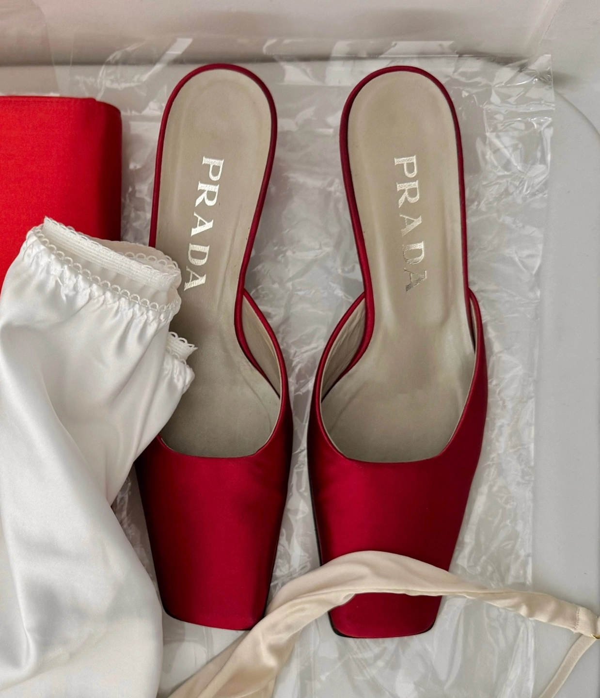 [PRE-OWNED] 2000s square toe red satin muleใ ฃItaly