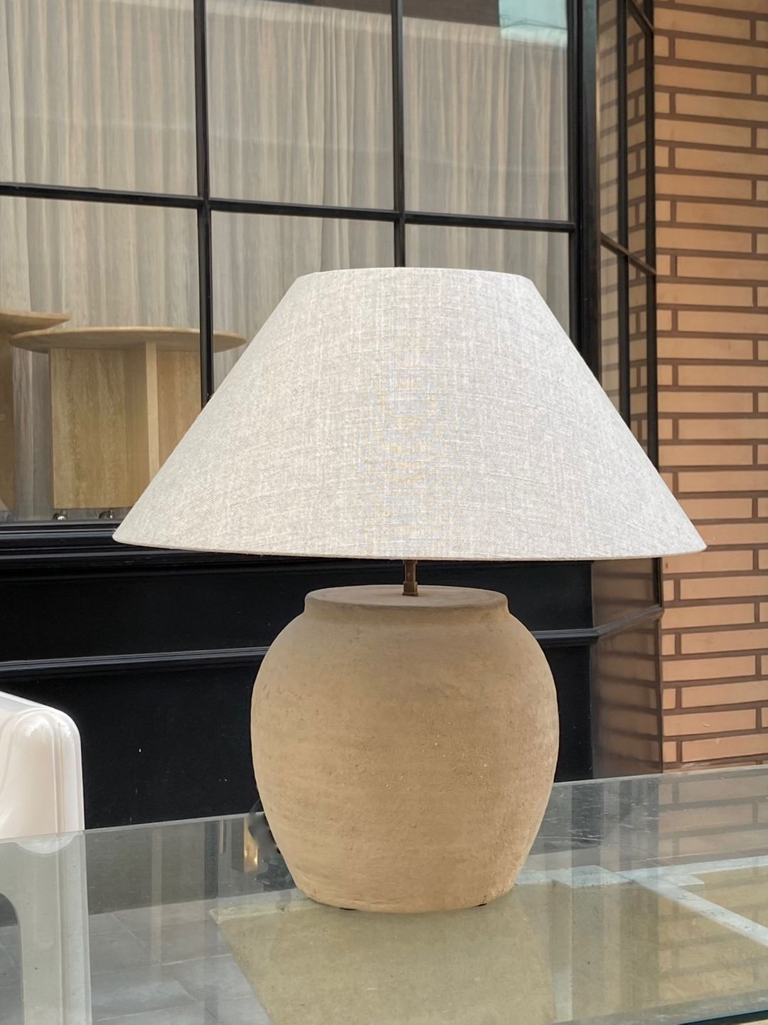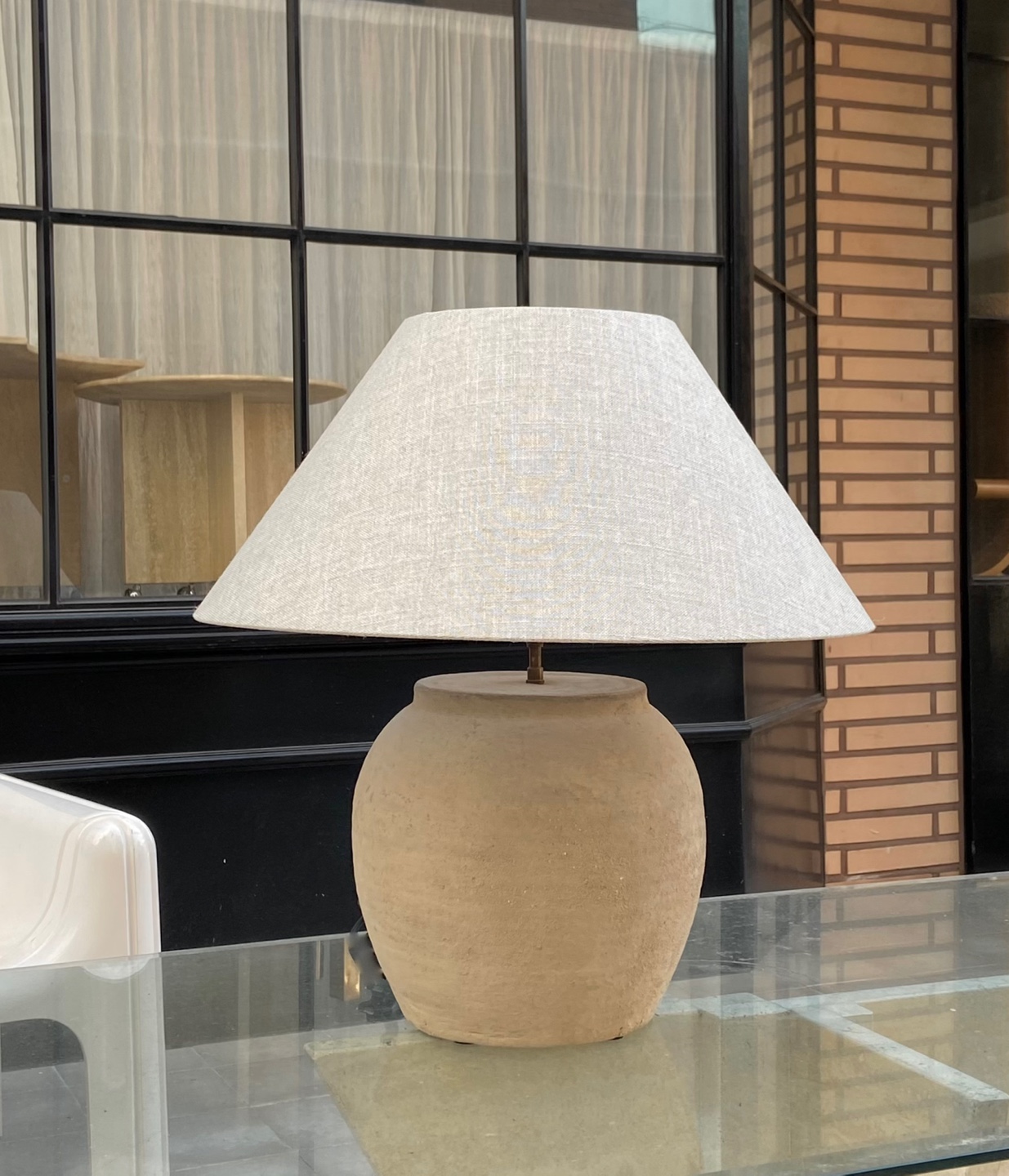 Antique clay pot lamp with natural linen shade by Andrea Lennon for The Corner studio, Belgium