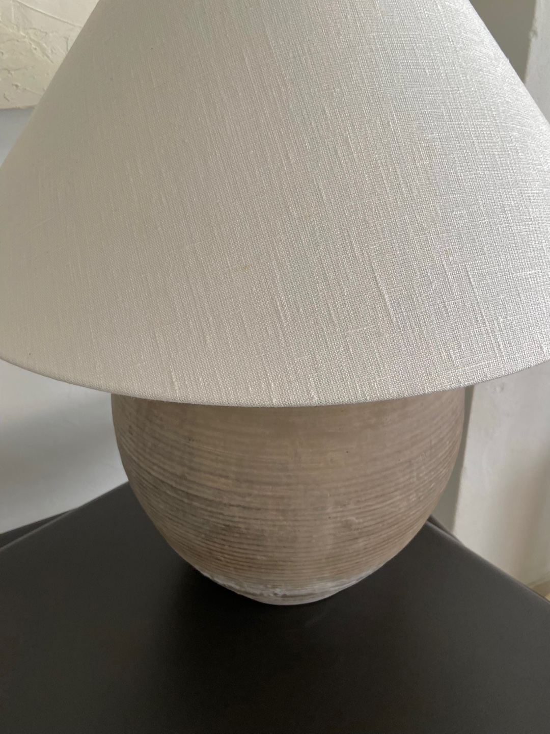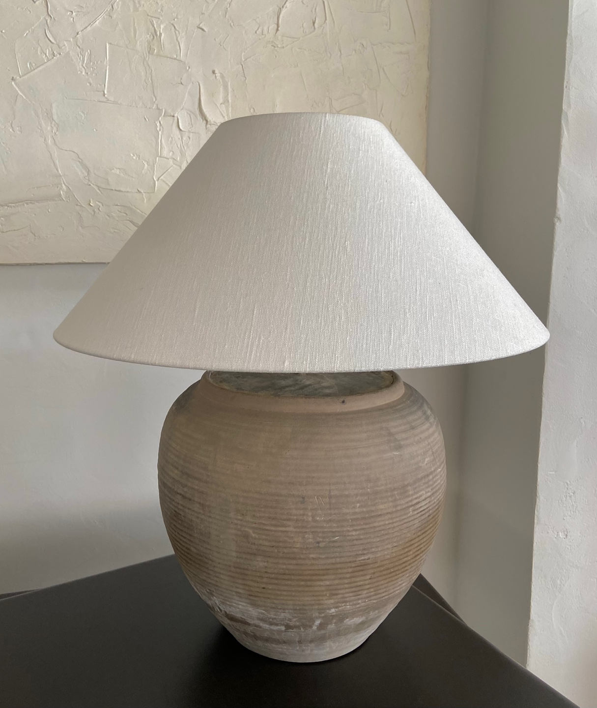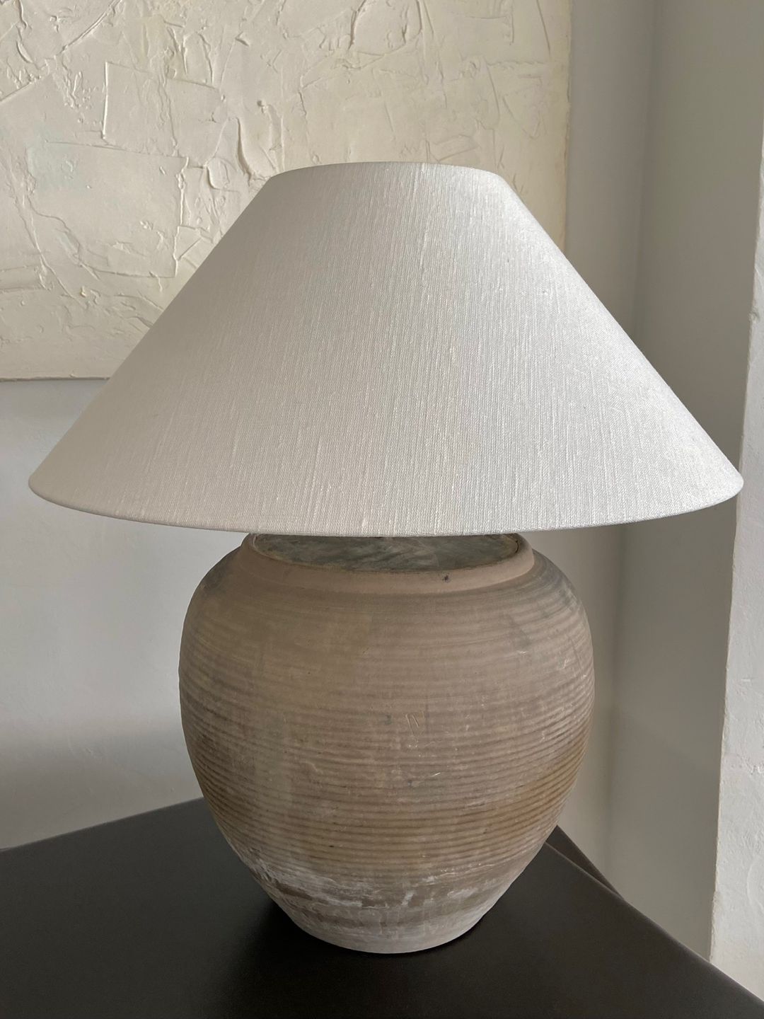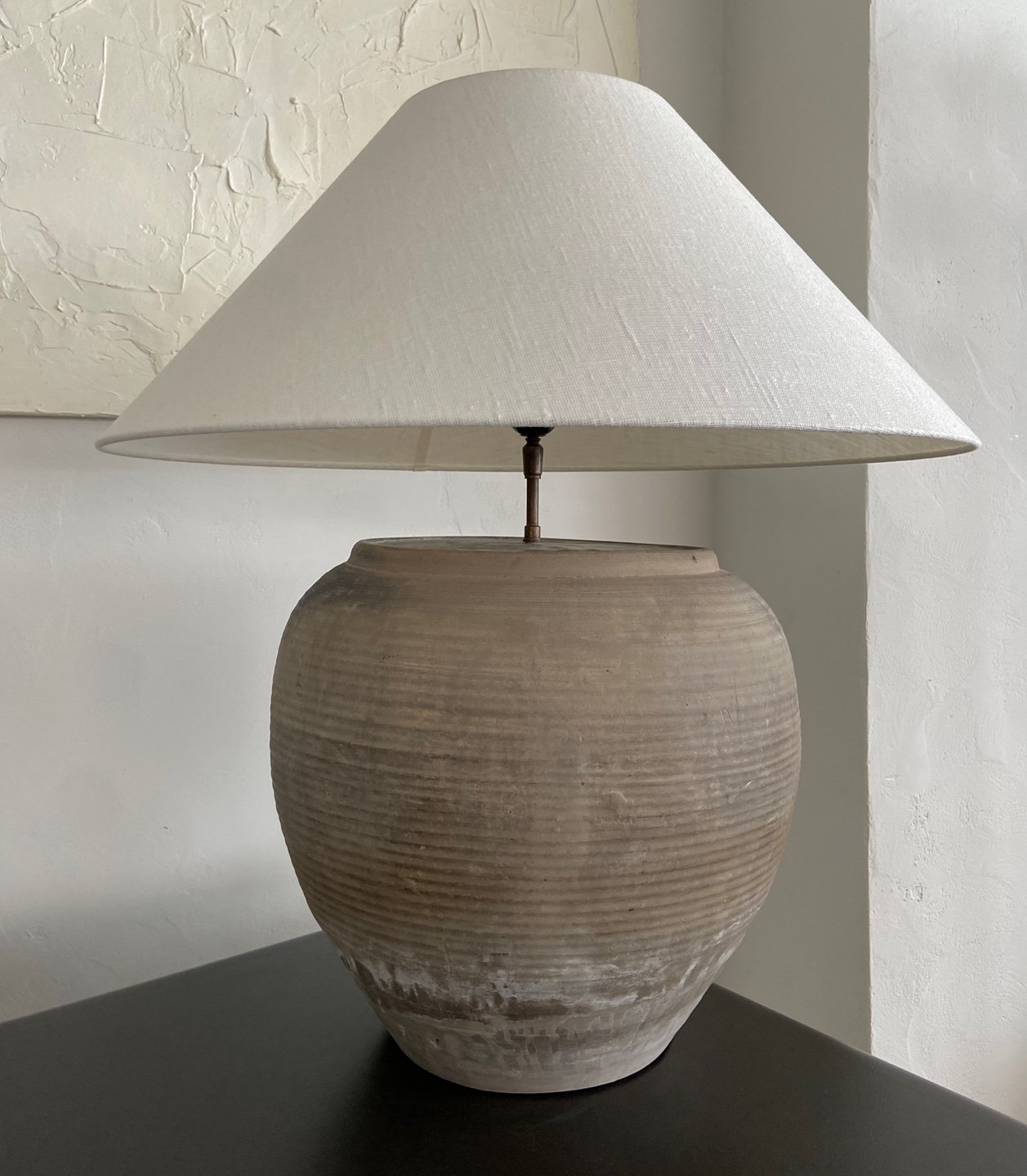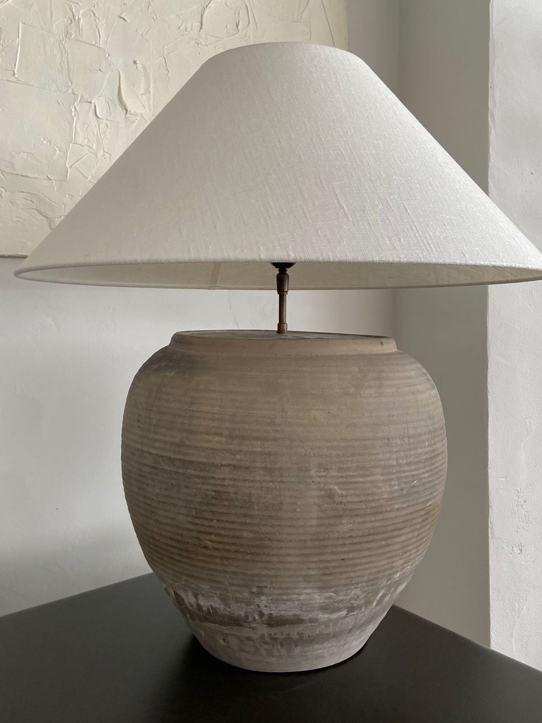 Antique clay pot lamp with natural linen shade by andrea lennon for The corner studio, Belgium