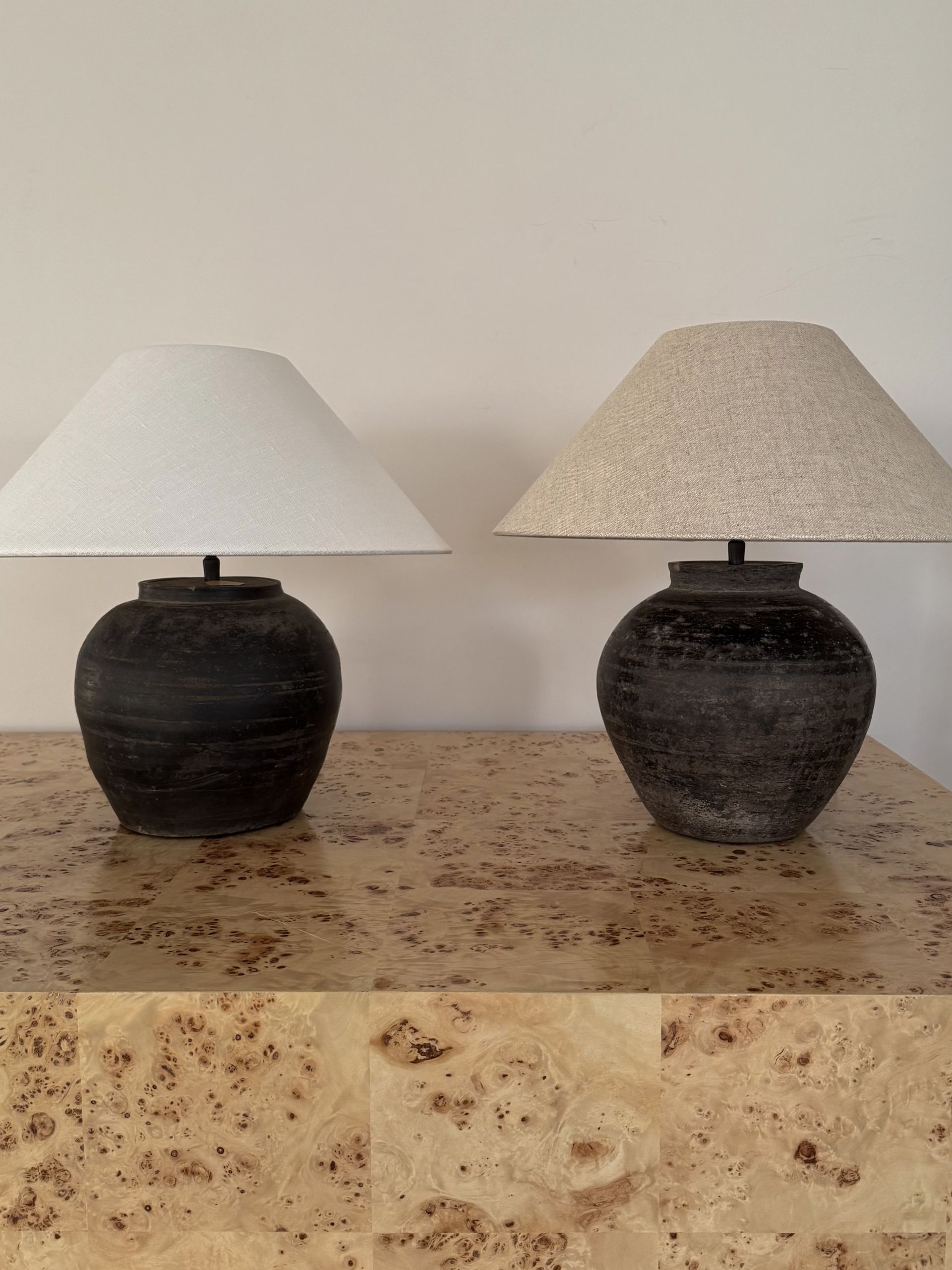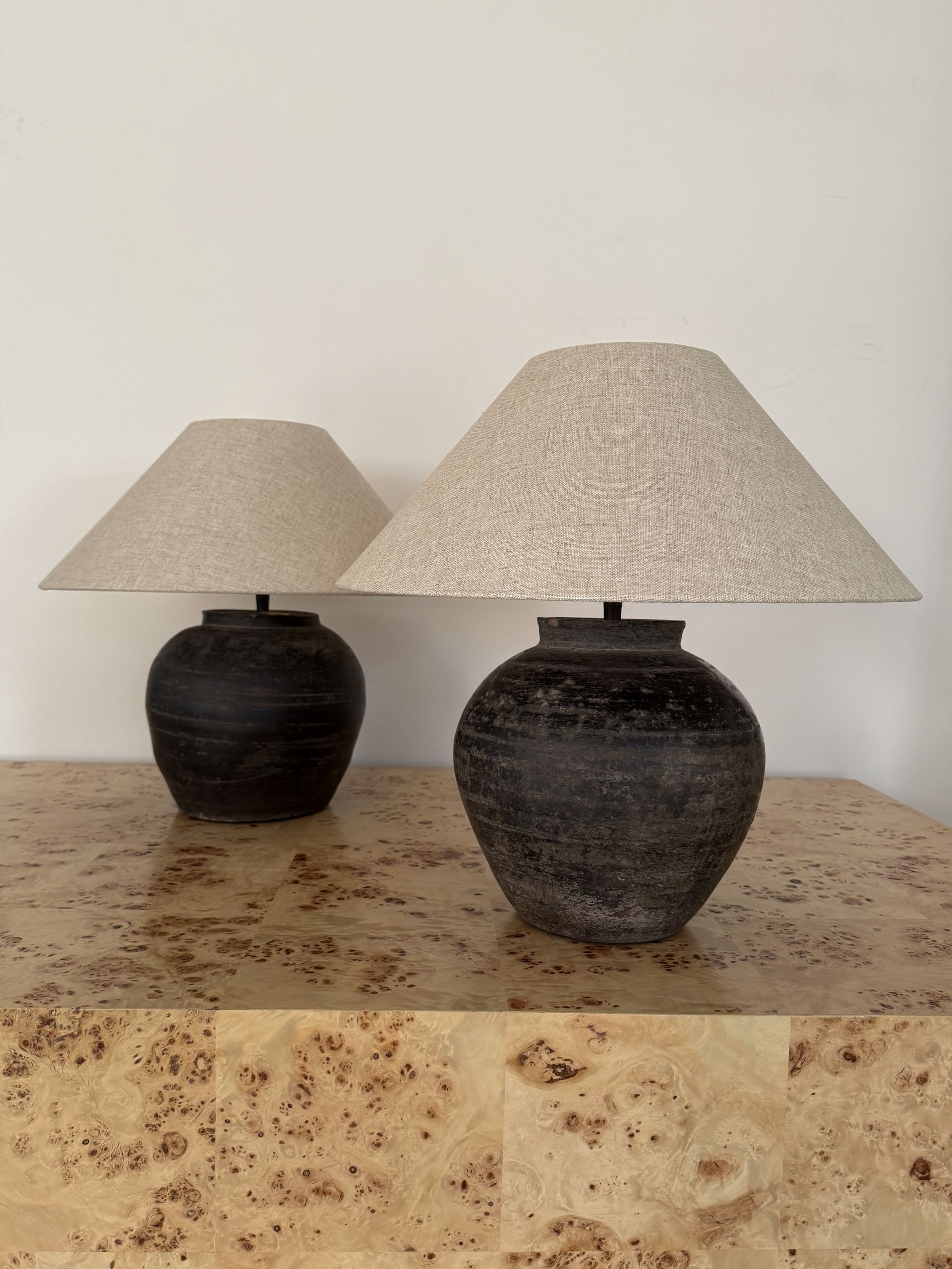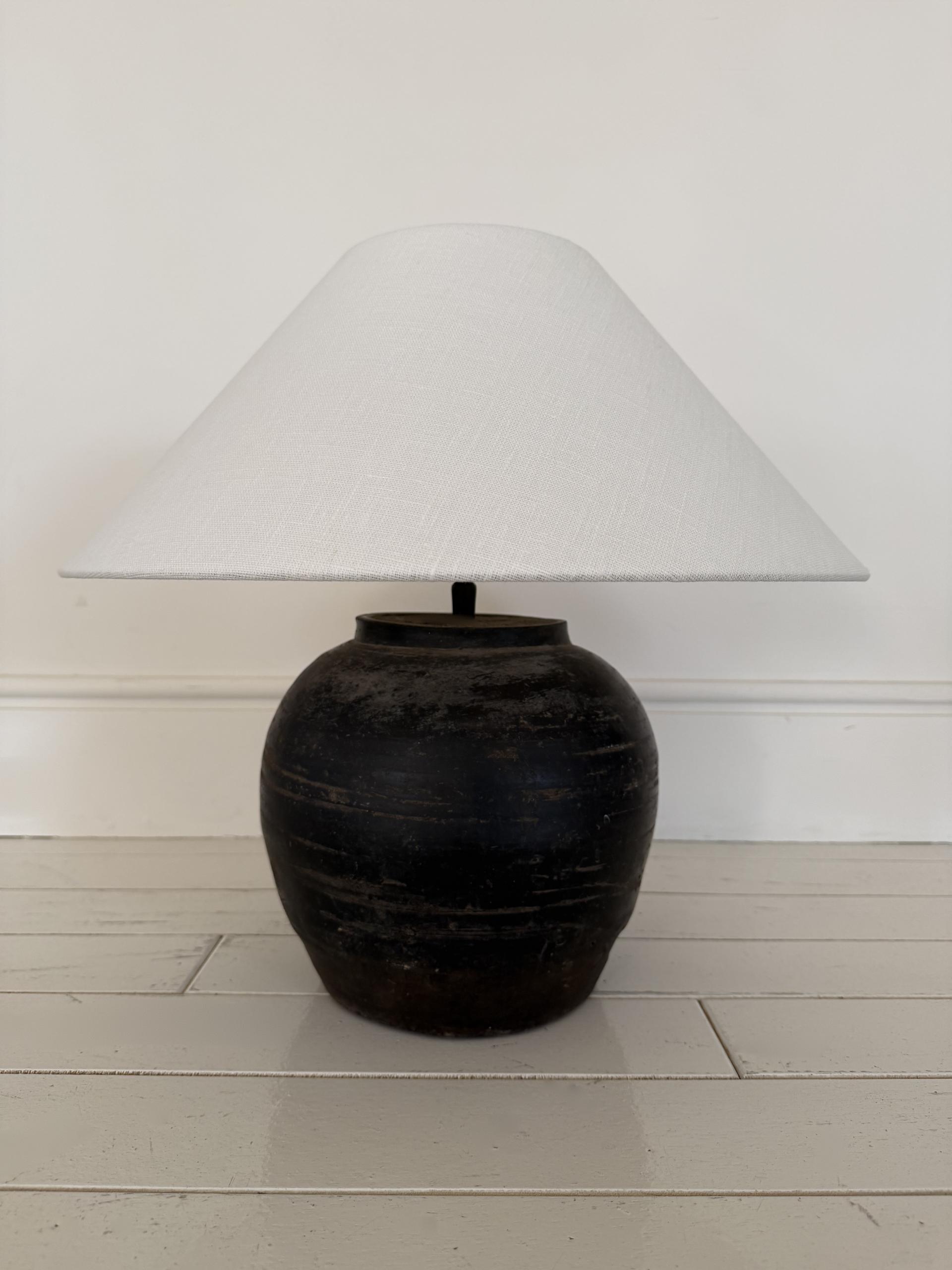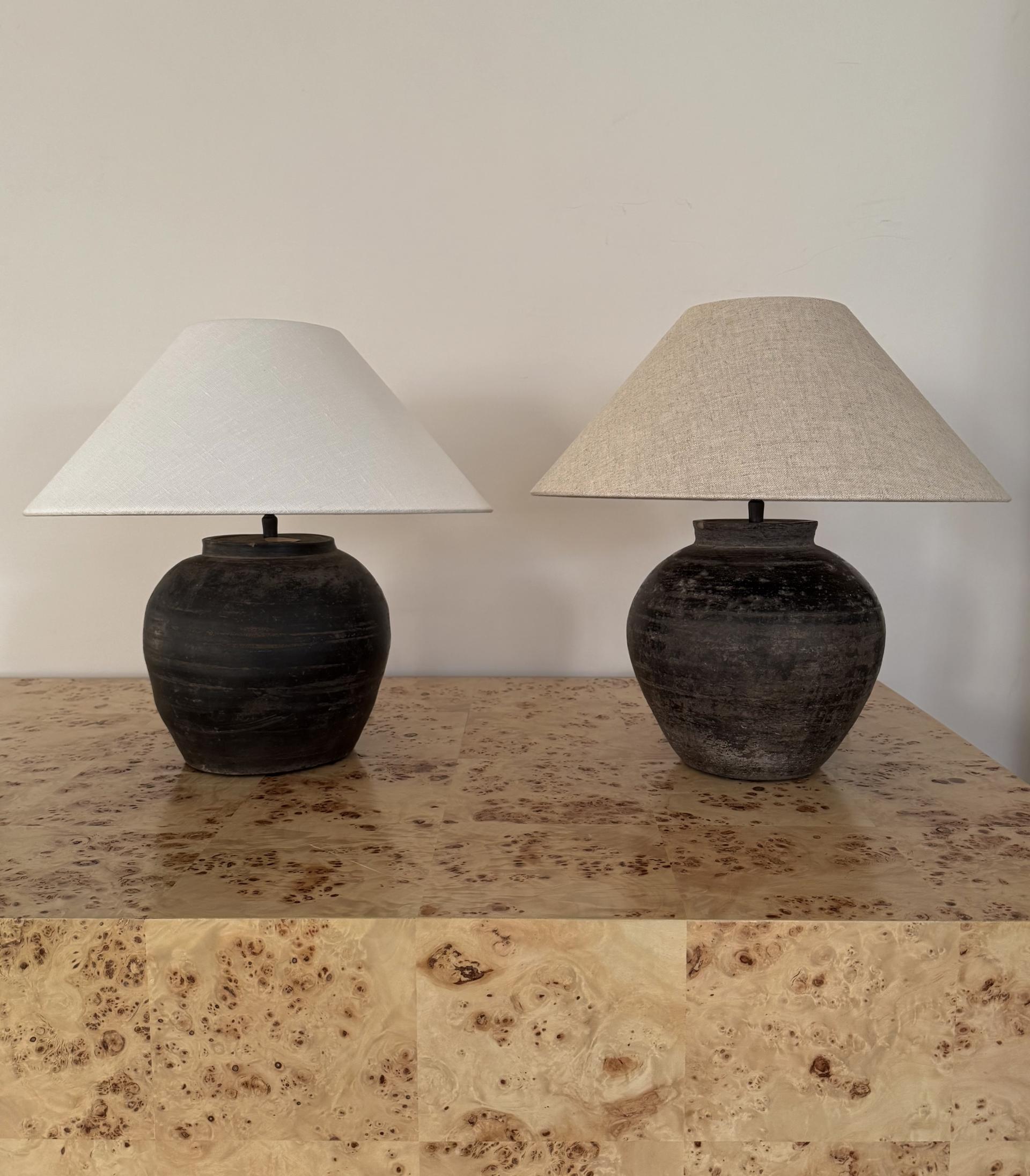 2020s Antique clay pot lamp with natural linen shade by andrea lennon for The corner studio, Belgium