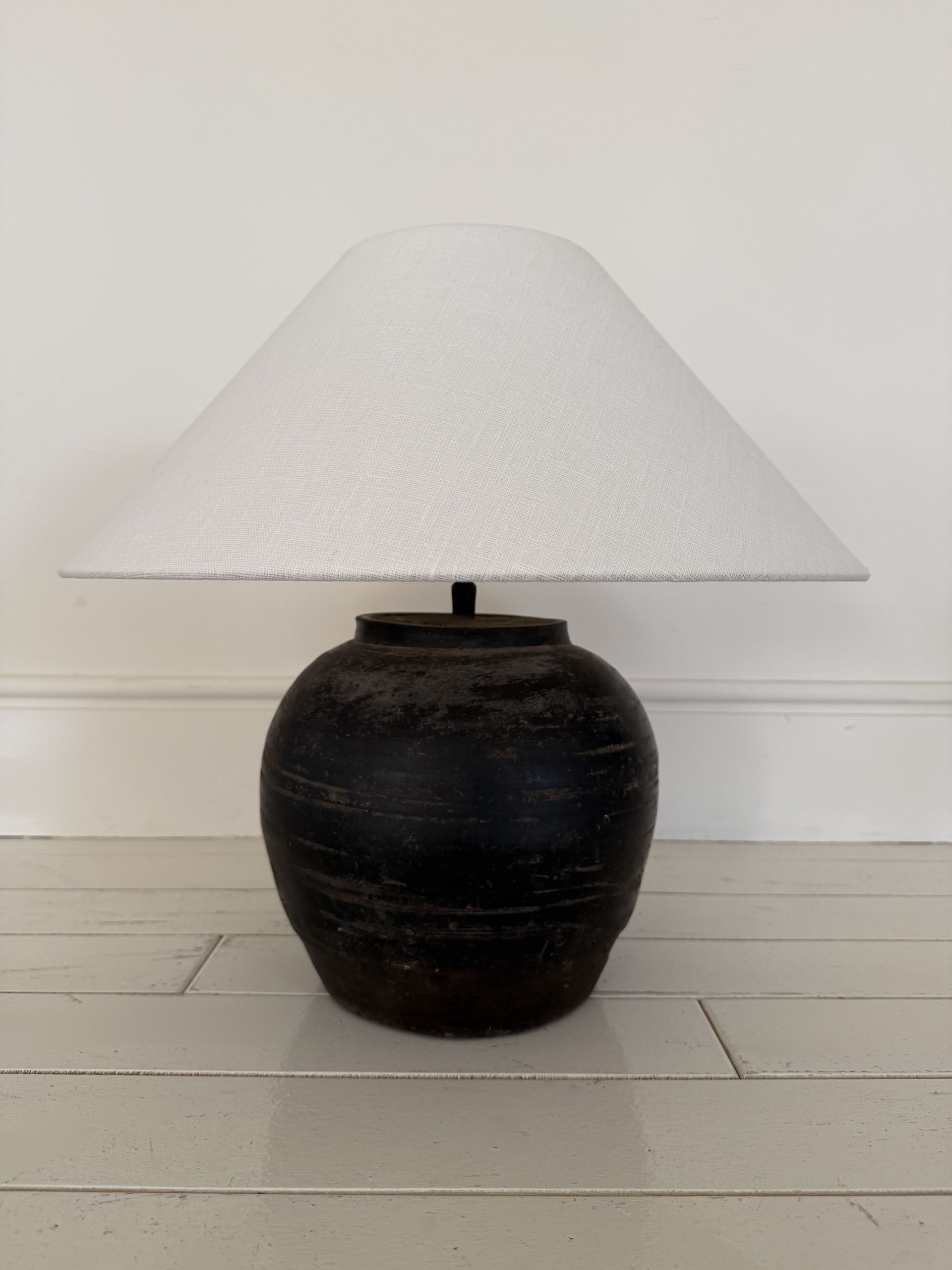 [SELECTED] 2020s Antique clay pot lamp with natural linen shadeㅣThe corner studio, Belgium