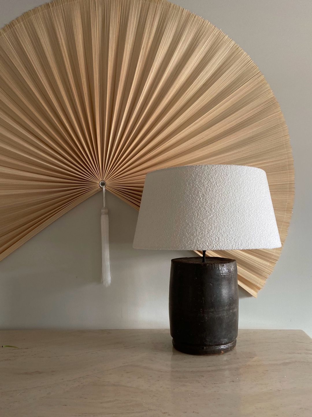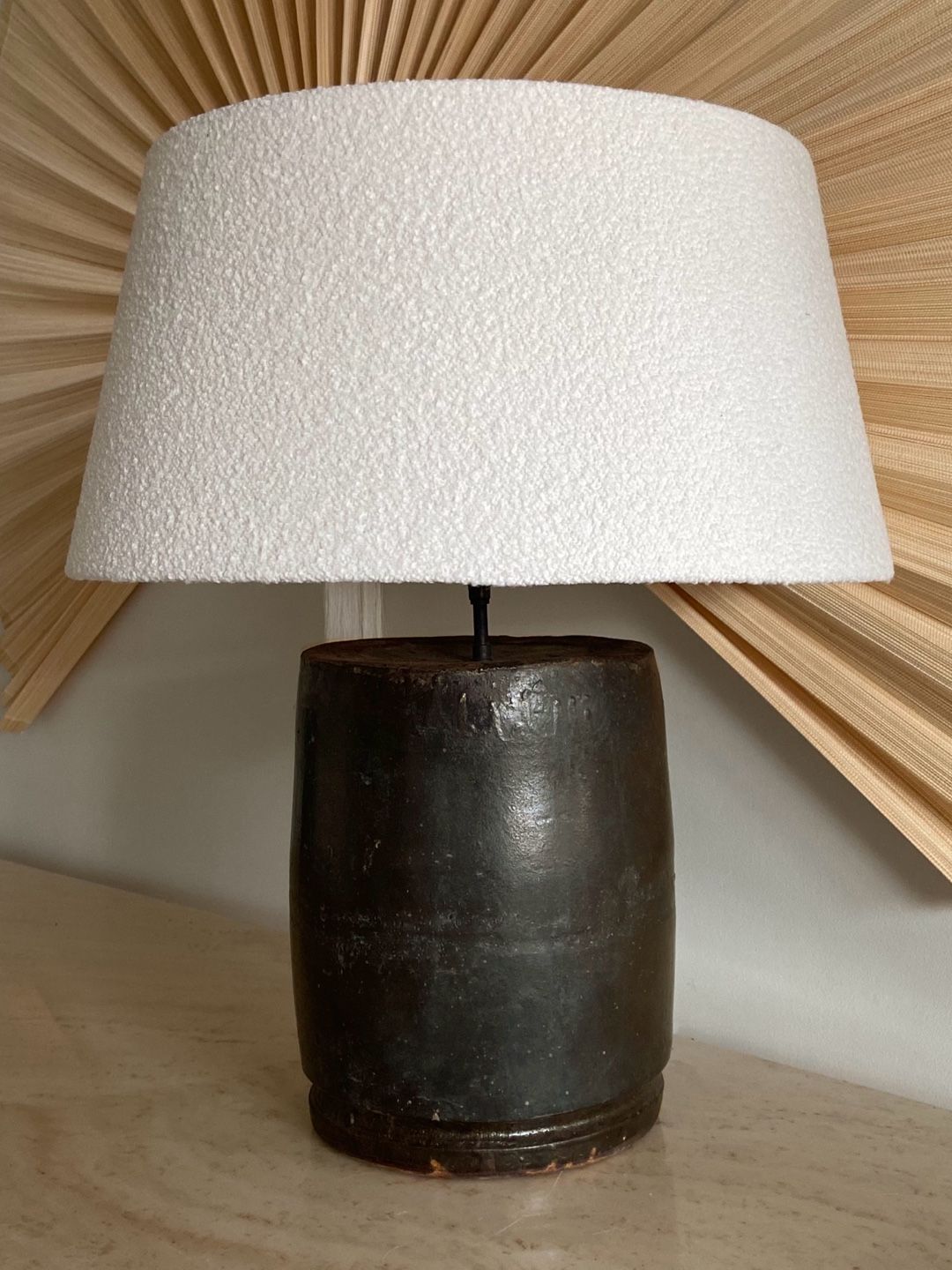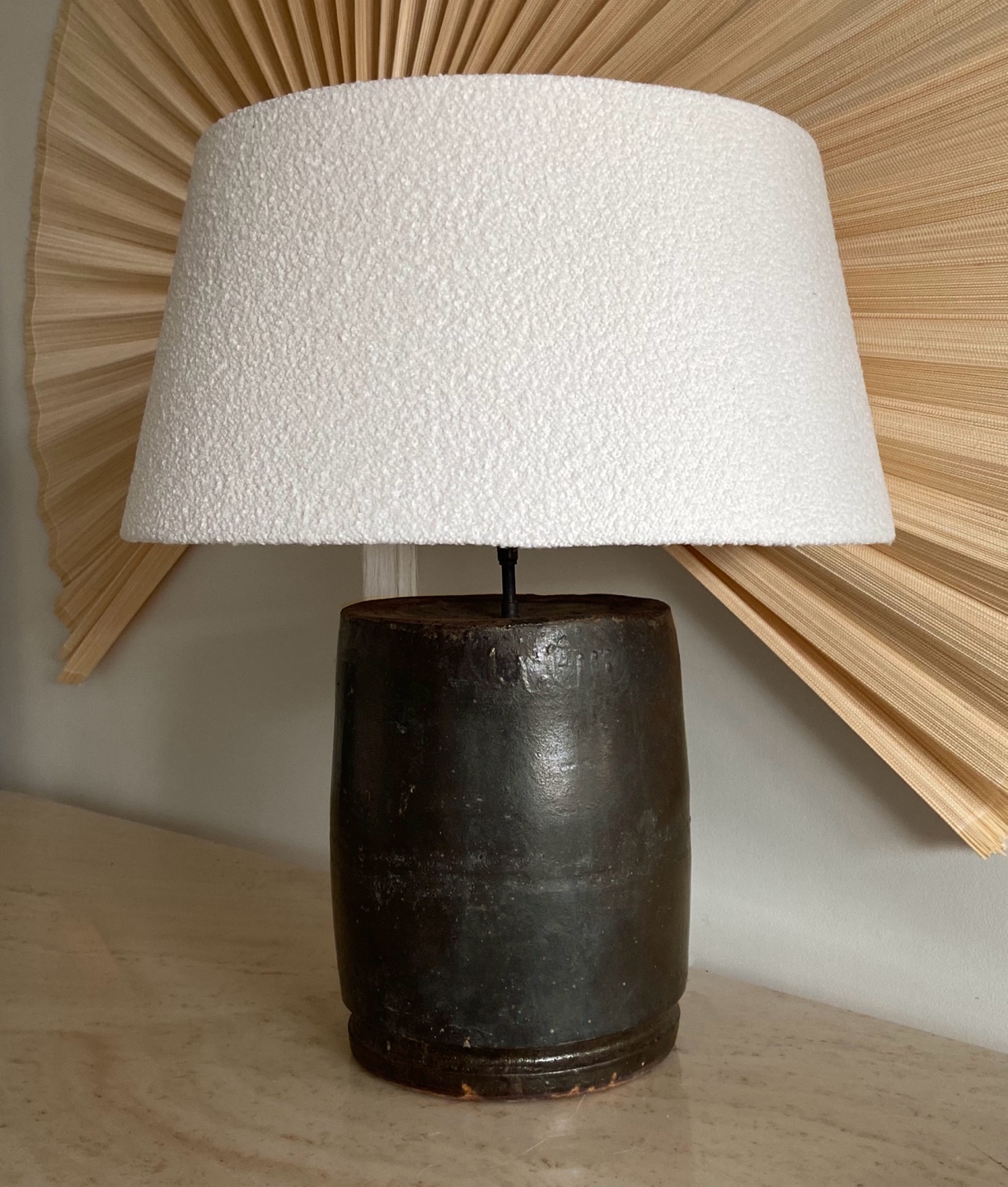 [SELECTED] 2020s Antique clay pot lamp with bouclé shadeㅣThe Corner studio, Belgium